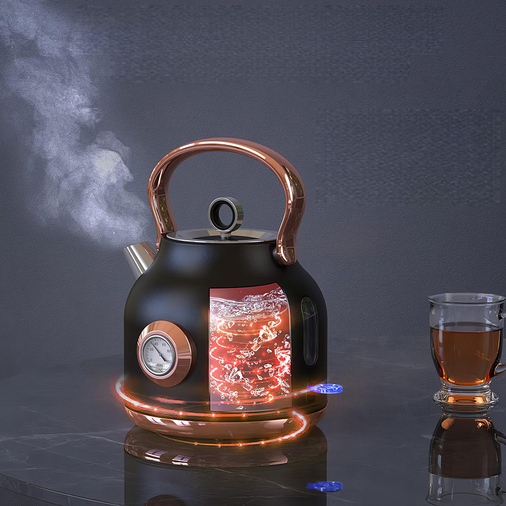 This 1.7L retro electric kettle combines vintage charm with modern safety and performance. The 1500W rapid-boil system heats water in minutes, while the built-in temperature gauge ensures perfect brewing every time. Made of food-grade stainless steel with auto shut-off, boil-dry protection, and LED indicators for safe, stylish daily use.